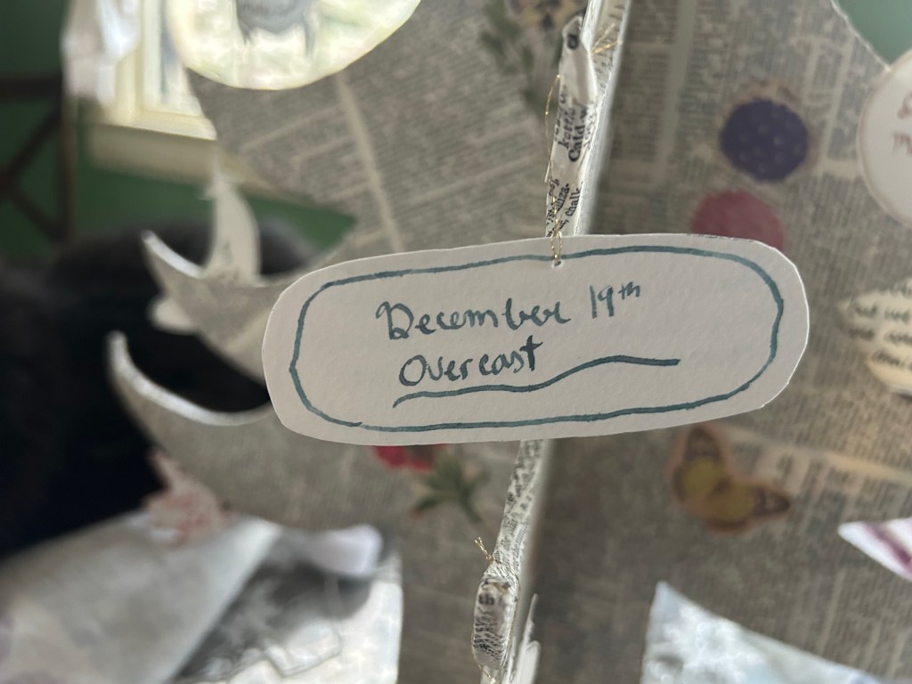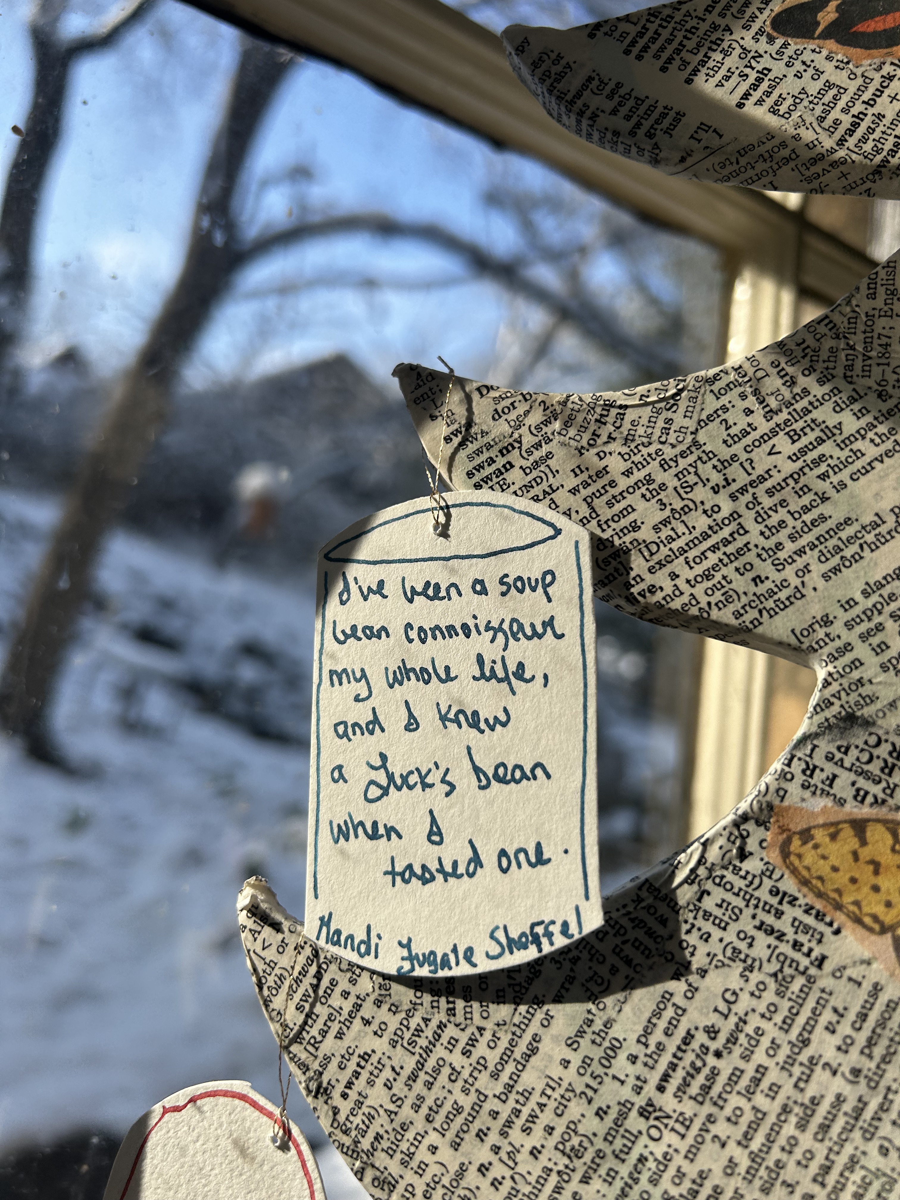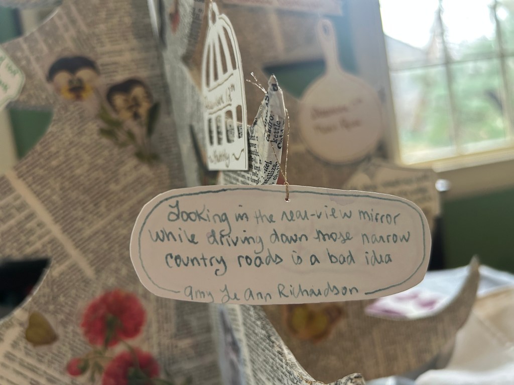 The line on the ornament is from an essay she wrote for Troublesome Rising about the work of salvaging artifacts and archives from the 2022 flood in Eastern Kentucky.