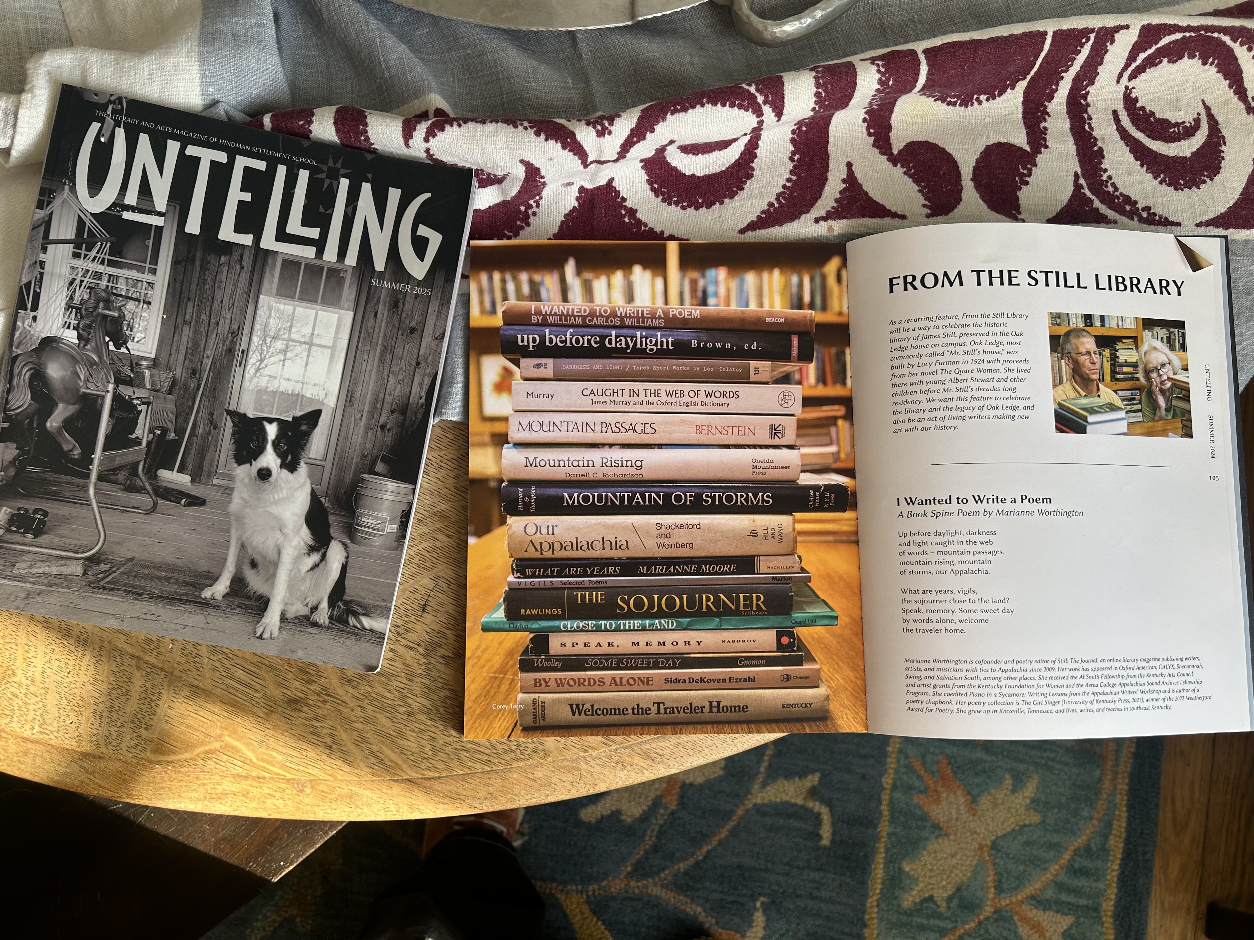 The lines I use in my ornament are from Marianne’s book spine poem in the Summer 2024 issue of Untelling. It’s a feature in every issue in the back pages- different writers are asked to take books from James Still’s office and stack them to make a poem. The photo of the books is by Corey Terry. James Still was a titan of Appalachian literature who lived for many years in Oak Ledge, a house built by Lucy Furman out of the proceeds of The Quare Women, her book about the remarkable women who founded the Hindman Settlement School. Tickles me pink that you can get this book today, even on Amazon- https://www.amazon.com/Quare-Women-Kentucky-Mountains-Industries/dp/1950564037 though I hope you’ll ask your local bookstore to order it for you instead.