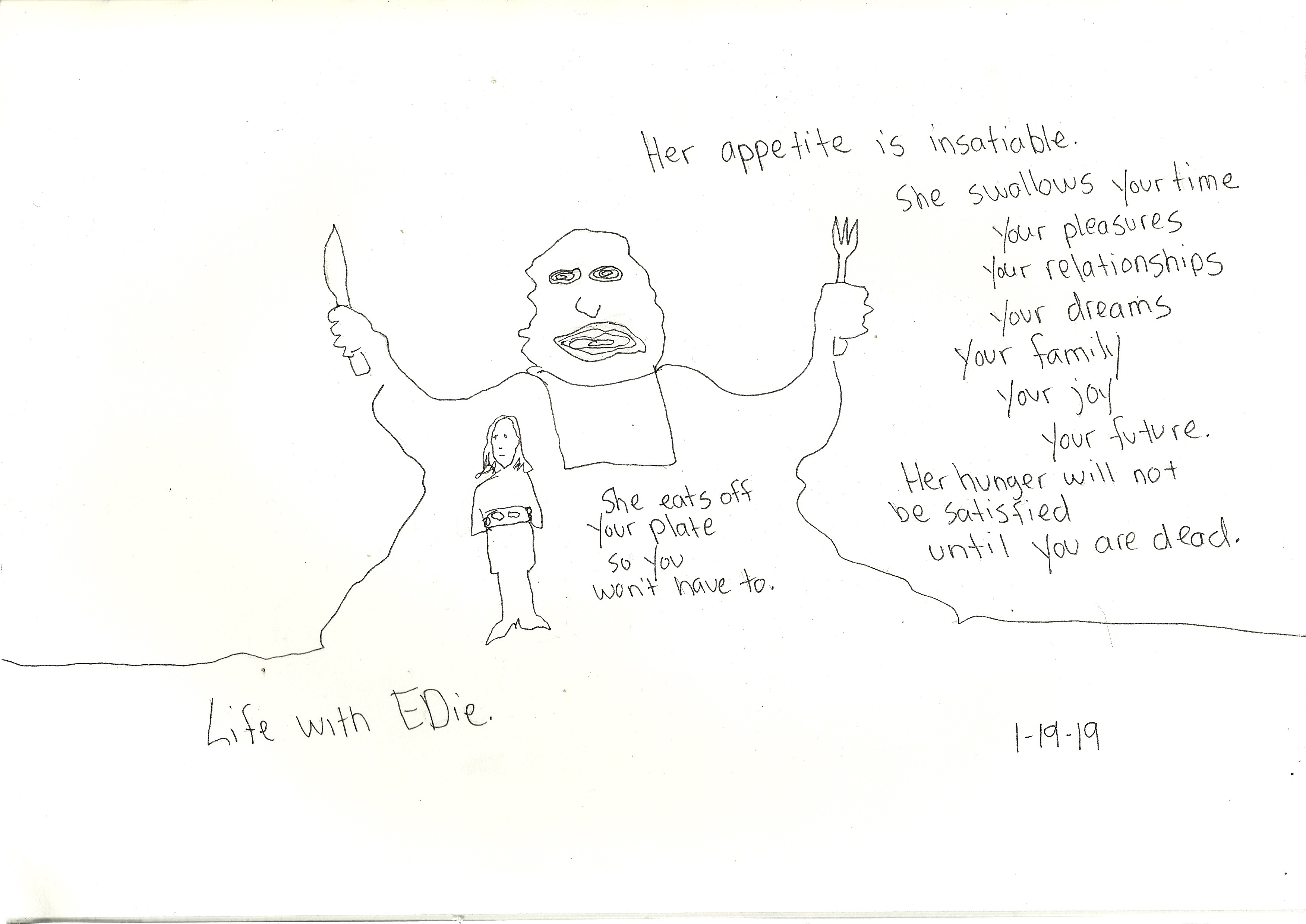 That Thanksgiving, the dark months that followed, I let go of that silence. I let the people at my jobs know what I was dealing with. I knew I needed to talk about it, be open about her illness. For her sake and for mine. I didn’t want her to be ashamed of it I didn’t want her to blame herself. If she was going to get better, she would have to embrace it, accept help, talk about it. If I was going to keep myself from coming apart, I was going to have to do the same. I had just started sharing art again on this blog as a practice, as a source of fun. Those drawings reflected a little of that early pain. I didn’t start writing about J’s journey with Edie, the demon Eating Disorder, until her return from residential treatment.