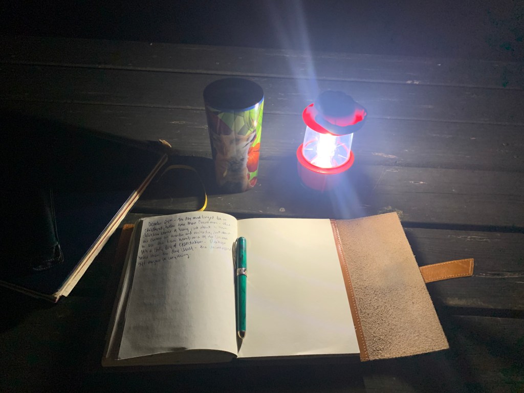 It’s before dawn out here in the little wood. The unseasonably warm weather has called me out here. I feel much better having written a bit. The prosaic demands of the holiday obscure the poetry of it, obscure the soul of it, which I crave. Kept too long in the saucepan of checklists, I bubble up into irritation, my gratitude sailing off like steam. Our family plans have changed fifteen times since Sunday, as fully vaxxed and boostered members of the family test positive for the insidious Omicron variant. Time here in the dark, under the trees helps me recover my footing.