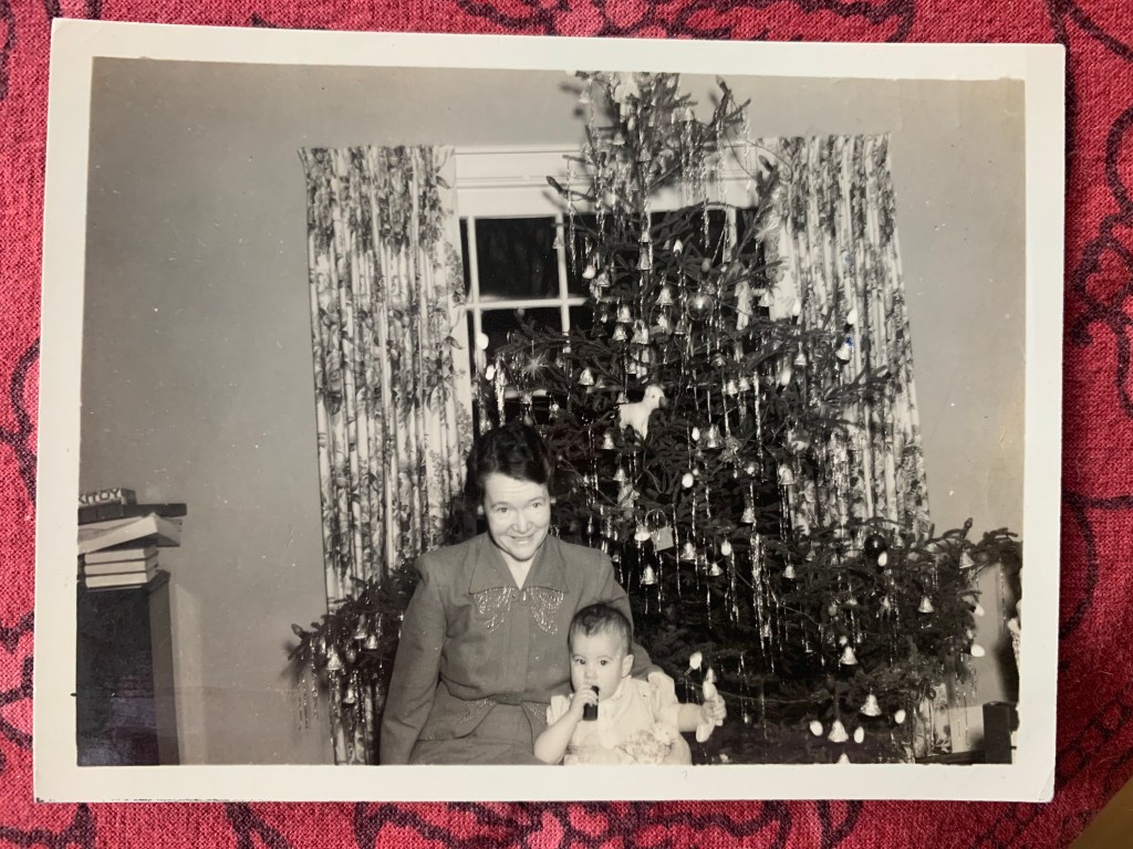 A photo has fallen out of my journal- an old black and white one that Mom gave me some months ago of Great-Aunt Virginia Cook and her infant daughter Carole. They are in front of their long ago Christmas Tree, hung with silver bells and tinsel. Aunt Gigi (not my real aunt, I only found out as a teenager) is smiling so beautifully, so much happiness radiates. A young widow, her horrible husband gone. She raised her daughter alone, working at a bookstore to do it. In the photo, there’s a stack of identical books on a table, with empty boxes set on top. Perhaps she is about to wrap them for gifts. I never noticed that about the photo before now. Many years after this photo, I would be one of the recipients of well-chosen books from her that would be touchstones for me throughout my life. Pickle Chiffon Pie by Jolly Roger Bradfield, The Tapestry Room by Mrs. Molesworth, Up a Road Slowly by Irene Hunt. Aunt Gigi scraped by, as I do, but she was one of the Wondermakers of the world. As am I.