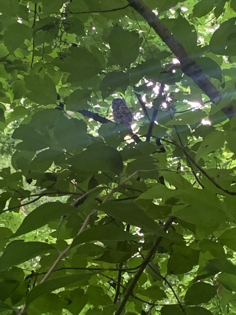 Seeking the peace of wild things, I crossed the empty Sunday morning street to make my way to the ravine woods hidden behind the veterans hospital just after dawn. Three young bucks have pulled up short on their crepuscular gallop to assess the threat I may be, sitting here writing in my journal on the stone bench by the trail. Their verdict is not yet in. Now one has ambled quietly away while the others continue to stare. Decision made, they turn their velvety antlers in unison and stroll off after their brother. It comforts me. Comfort too, knowing that if I were to walk back up the trail and go only a little way down the ivied deer path, I would see the barred owl sitting placidly on a low limb, unconcerned by the quiet, gawking me who stood there not long ago silently composing a silly poem in rhyming couplet that went something like this: