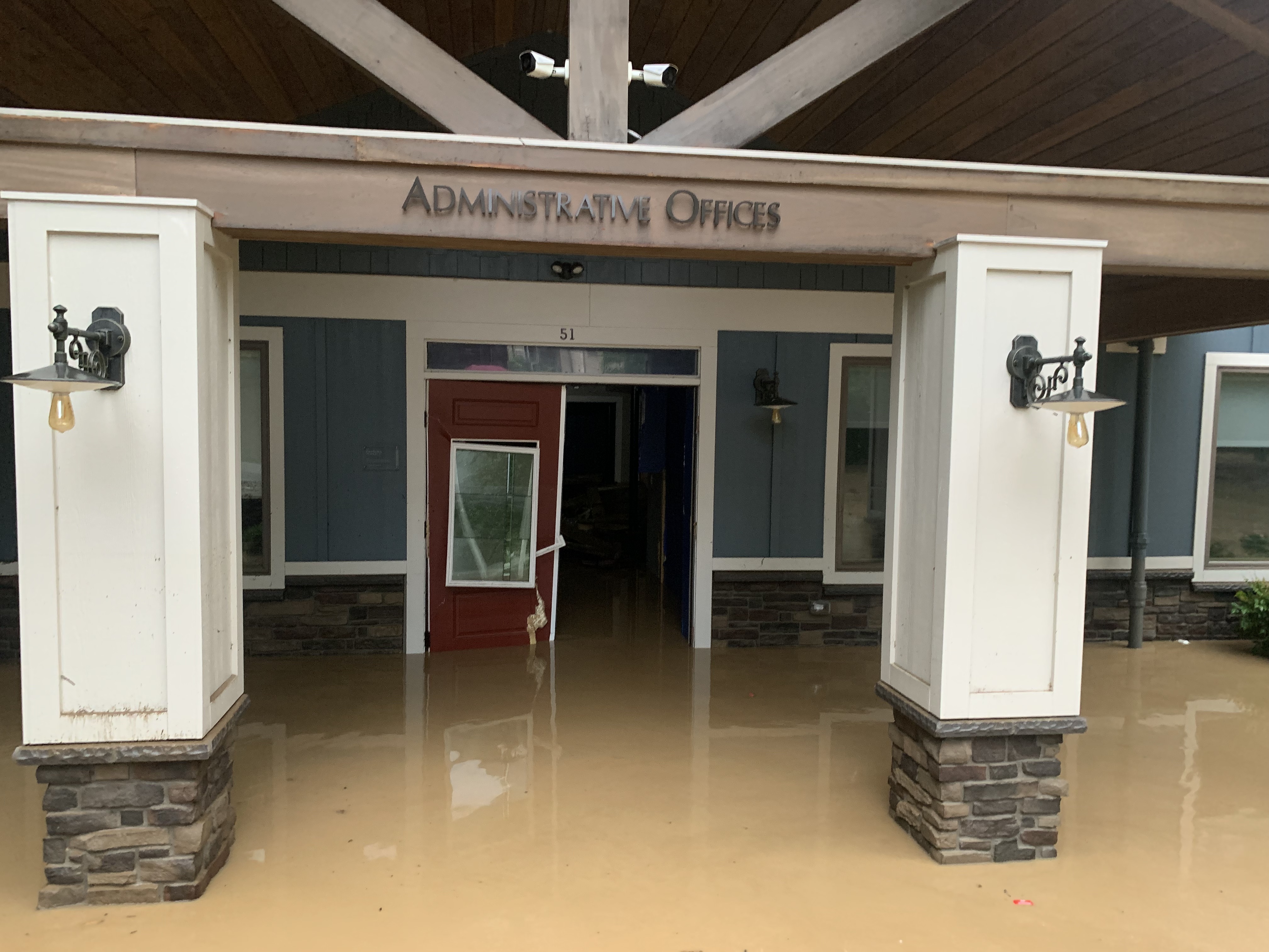 The rain pounded, lightning flashed. More and more people were waking up, some heading to their cars. Josh Mullins, Hindman program director was soaked, the other Hindman staff too- all going to and fro trying to make sure that folks in the lower apartments were out. Former Kentucky Poet Laureate George Ella Lyon was in one of those apartments with poet Nickole Brown who had a hunch the world was about to explode. She didn’t go to sleep, but packed up her things at midnight and kept watch over the creek. It started rising so rapidly that by the time she alerted George Ella and helped her pack, water was coming through their door. They landed up at Stuckey, which became the refuge for all the Hindman folks in precarious lodgings. I grabbed my keys and moved my car even further up- driving up the little road that wends its way up past Stucky to the highest house on campus, others followed. People were crying, some had already lost their cars, their trucks, Tamela’s brand new dream BMX motorcycle- they had moved too late. That little tiny creek had risen impossibly fast, higher than anyone had ever seen. Some people stayed inside the living room together, some in their rooms, some on the front porch waiting for the glimpse of the creek that the lightning would give us. It’s over the bridge now, no way out or in. Josh and his team were down in the MIke Mullins Center, trying to pull things to safety from the downstairs offices- the computers, the archives. Josh could see that the creek was up against the new plate glass windows. He was thankful they had put in steel doors when suddenly the creek busted them wide open and all of Troublesome poured in. They got upstairs safely and out the second floor exit.