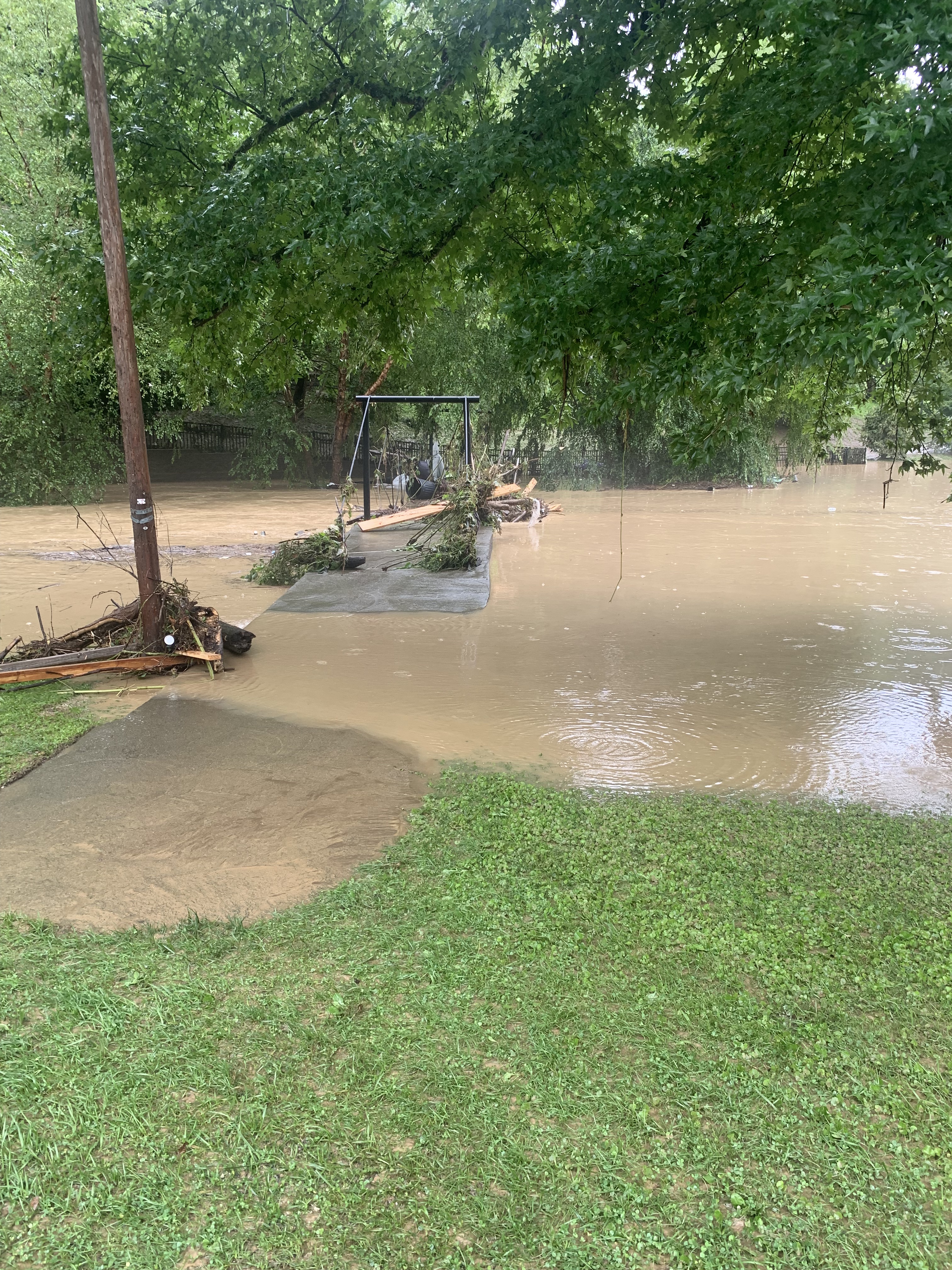 July 28th, I was at the Appalachian Writer’s workshop when the flood came. We were halfway through our blessed week. It had rained a lot and we could see that Troublesome was rising a bit, one foot, two feet, well within its banks. Wednesday was a great day- classes, communal meals, evening faculty readings and a trivia game night. Alerts for flash floods came across our phones, you know, the ones we all have learned to disregard. But that afternoon I told my roommate that I thought she should move her car away from the creek side of the main building. Mine was already on a higher spot. Really? She said. Yeah. Just in case. So she did, finding one last spot by mine. It rained hard all evening through our programs and socializing. It had been such a great day, I had trouble falling asleep. It was midnight when I did. At about 2:30 there was loud knocking and urgent voices, something about moving cars if they were on the low side. I stumbled to the hall, heard them say that Troublesome was rising fast. I went to the bathroom and flicked on the light, only there was no light. The electricity was gone. There was this roaring sound I couldn’t place- I shone my phone light out the bathroom window and could see that the usually bone dry little channel beside our residence, called Stucky House, was a white water torrent of water pouring down from the hillsides into Troublesome. DO something, do something. I started filling all the empty gallon containers in the kitchen from the tap in case we’d soon be without safe water. I filled the bathtub. It was all I could think to do.