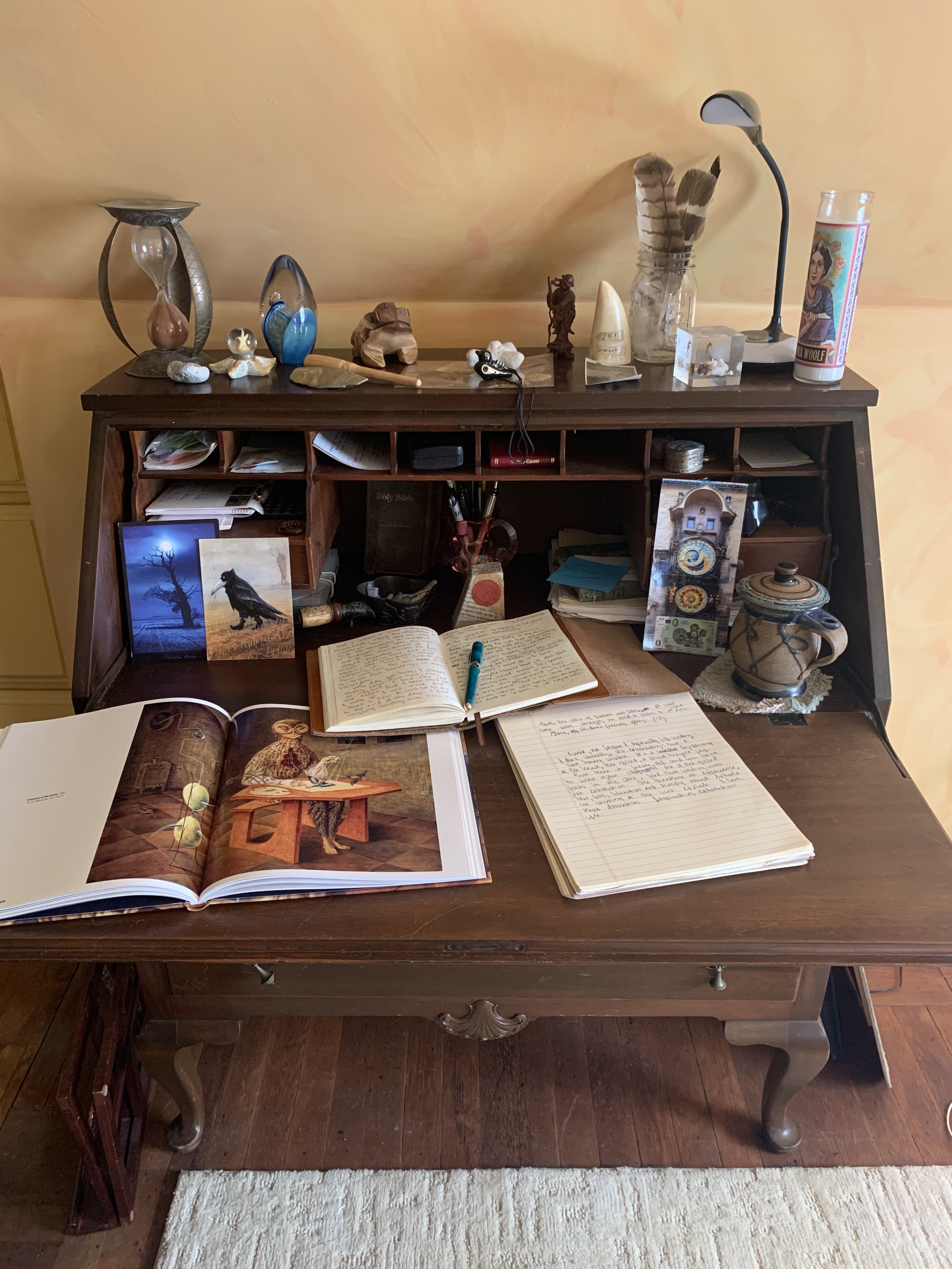 My office at home isn’t a room exactly, more like an odd-shaped hall at the top of the stairs leading to other rooms, a feng shui nightmare as energy hemorrhages from that space. It’s okay for business type stuff but not for the deep dive needed for writing. I fiddled with spaces all last year- found the best settings for my various zoom classes, rearranged furniture, created a writing space in my bedroom where I actually have a door to close. I designated different desks in the house for different endeavors. I have a ridiculous number of desks, perfect for someone who habitually takes on too much.
