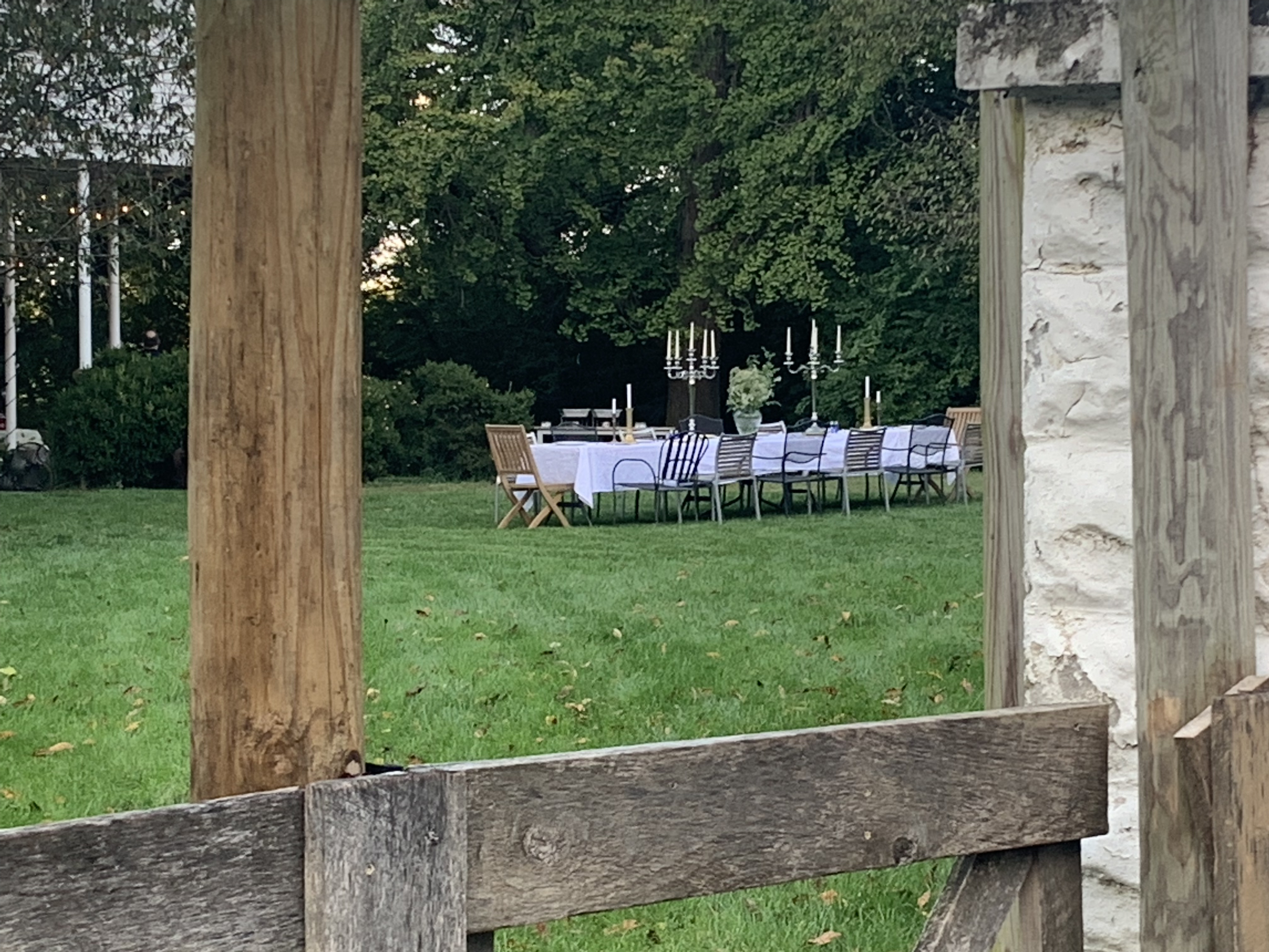 Men and their leaf blowers have no love for the unwinding of the day as the sun slips down between late afternoon and evening. I shake my fists at them and walk by with my middle fingers in my ears. I know I am invisible to them, all they can see is their task. My neighbors in the big white farmhouse have set up a long, long table in the middle of their yard with white linen and enormous candelabras. I expect the Mad Hatter and the March Hare will arrive soon followed by a sleepy Dormouse and then a befuddled Alice. It is a delightful sight. It’s a Friday night and once again I am home alone, breathing a sigh of relief. My week is always so very full, so many students, colleagues, all in motion, a buzzing hive of exploration and things that must be done.