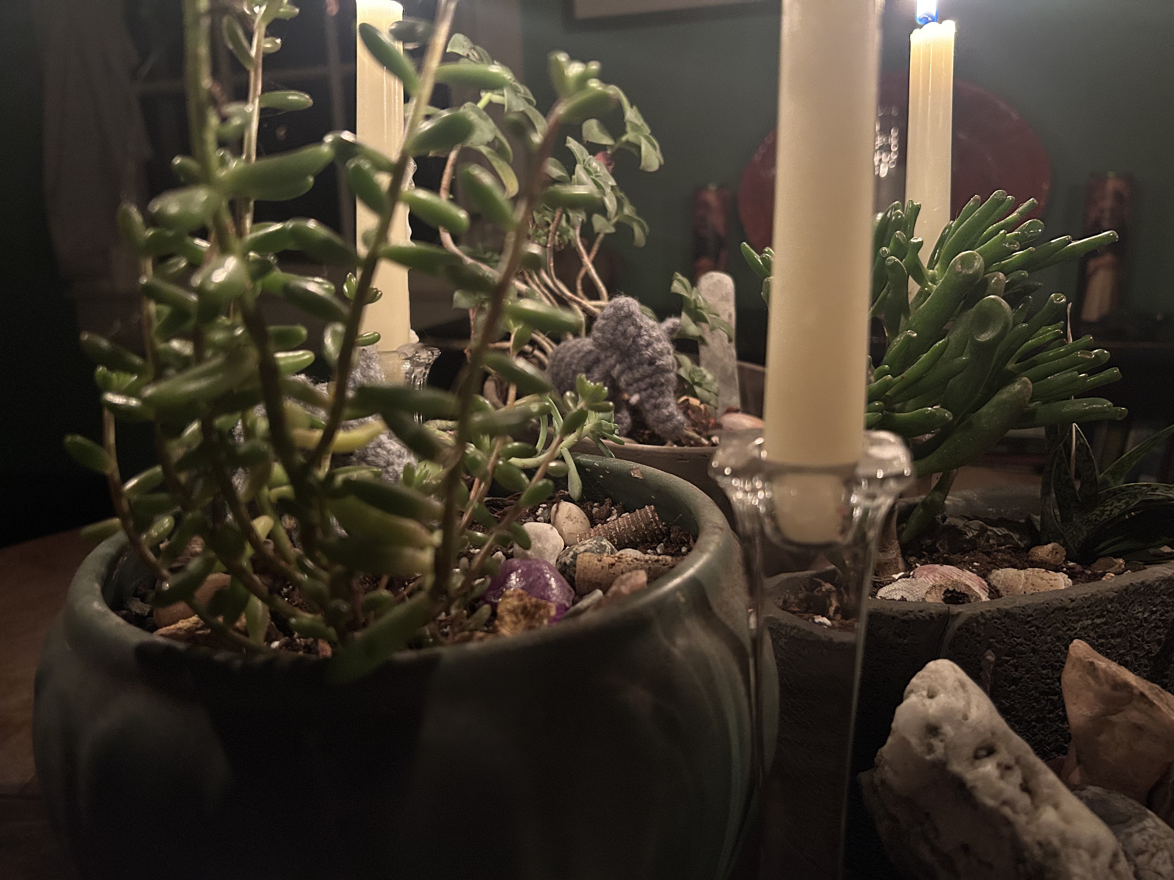I cleaned and shifted things around to make room for the outdoor plants to be brought in, a Fall ritual that marks the end of the sun’s season of heat. Warmth will be found indoors now. Warmth will be made inside. I moved the cat tree to the front door nook that is never used at all, and I carefully moved the cacti in its place at the half of the French door that remains closed. One of my cactuses is over five feet tall, getting taller every year and harder to move. It will now spend the winter in my sunniest window. I moved the succulents to the center of the dining room table where the sun hits in the afternoon. And I moved the heirloom pothos, all ten pots of them, to their winter place on the wrought iron etagere I was given in the fourth grade for my new room at 12 Eastover Court when Mom and PeteDad were trying for a fresh start in a new house.