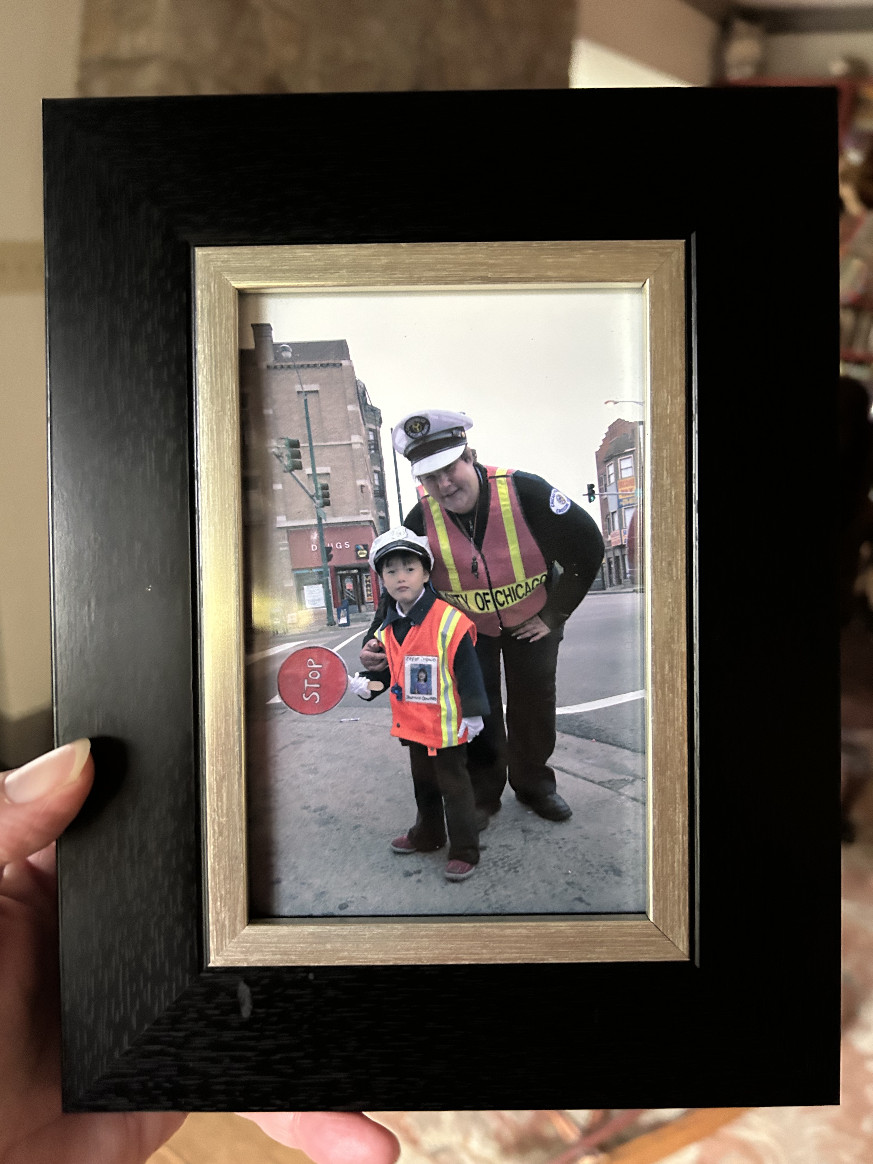 She wore it to school on Halloween and we took pictures with her heroes Debbie and Emily. Debbie was delighted. She stayed our crossing guard for years. Jess’s elementary school was closer to us than the pre-school, so once she went to kindergarten, we only had one crossing guard. Debbie adored Jess and gave her gifts for Christmas and her birthday, and we did the same. She felt like family. Emily was the crossing guard by the pre-school. She was a very tall, imposing woman who was gruff and never smiled at anyone. She did not seem to match her name. She wore a lot of armor, but we always talked cheerfully with her and after a couple of months she wasn’t so suspicious of us. When she saw Jess dressed as a crossing guard, she broke into the first smile I ever saw. Then she teared up. “No one has ever wanted to be me before” she said. And then I teared up, my heart breaking a little. The picture I took of them together twenty years ago on that Chicago street corner sits on a table in my living room. I sat with it a long time in my hands last night, remembering. I wonder if the print I gave her sits on her living room table too. I wonder if we conjured each other’s ghosts last night.